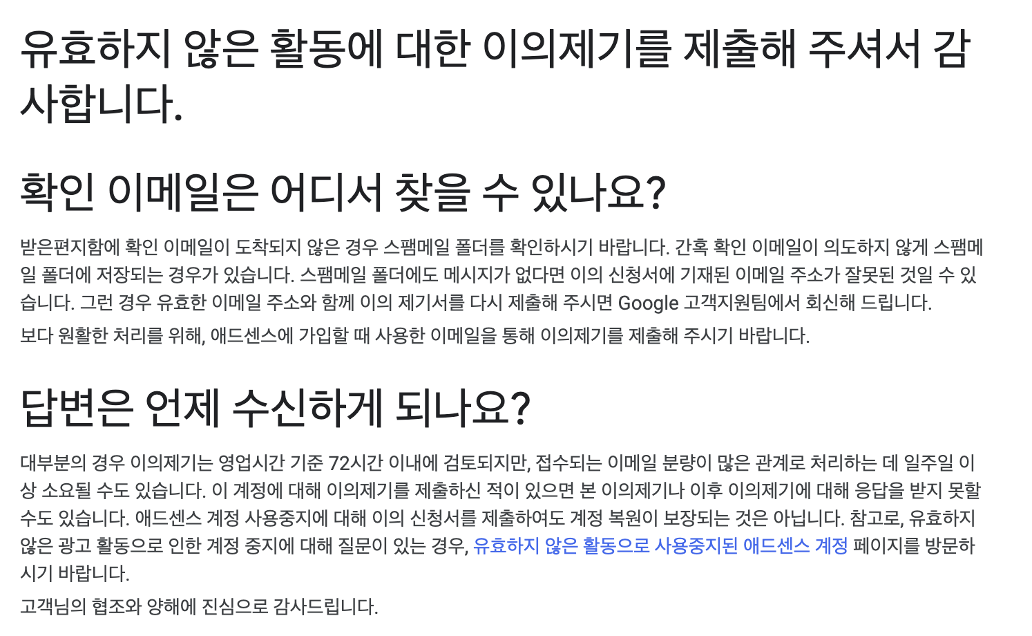 애드몹 ID / 무효 활동발생한 사유 / 대처 방안등에 대해서 작성하여 이의 신청하여 제출하였습니다.