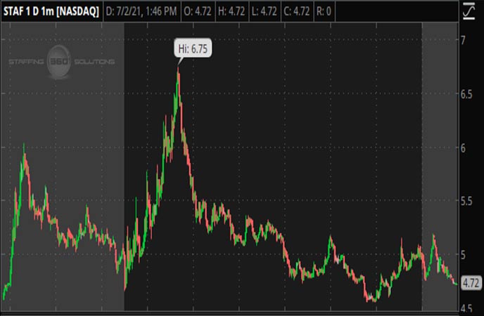 6월 30일, 회사는 NASDAQ 상장을 유지하기 위해 주식 역분할을 발표했습니다. 이 주식 분할은 6월 30일 오후 5시에 발생했습니다. 분할 이후 STAF 주식은 7월 2일 주당 평균 $3.74에서 주당 평균 $5로 떨어졌습니다.