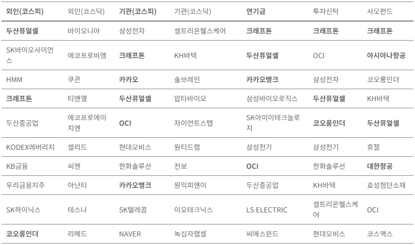 | SK바이오사이언스 | 에코프로비엠 | 크래프톤 | KH바텍 | 두산퓨얼셀 | OCI | 아시아나항공 |