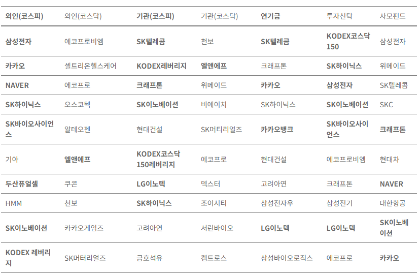 | NAVER | 에코프로 | 크래프톤 | 위메이드 | 카카오 | 삼성전자 | SK텔레콤 |