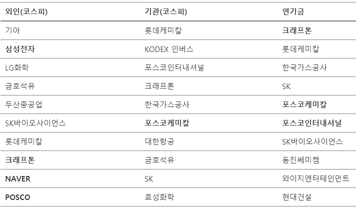 | 기아 | 롯데케미칼 | 크래프톤 |