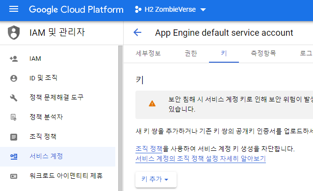 2. Service key 를 확인함 (Firebase에 upload를 위한 key 필요)