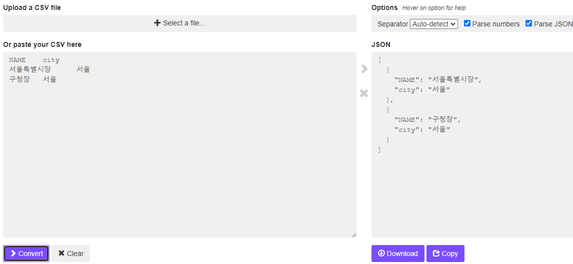 CSV file 혹은 text를 copy 하여 convert하면 json으로 변환됩니다. download하거나 copy 해서 사용하세요.